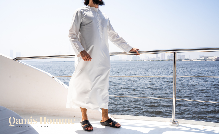 There’s also the short Qamis, known as the Pakistani style, often worn with matching men’s sirwal trousers. It’s more casual and perfect for everyday wear.