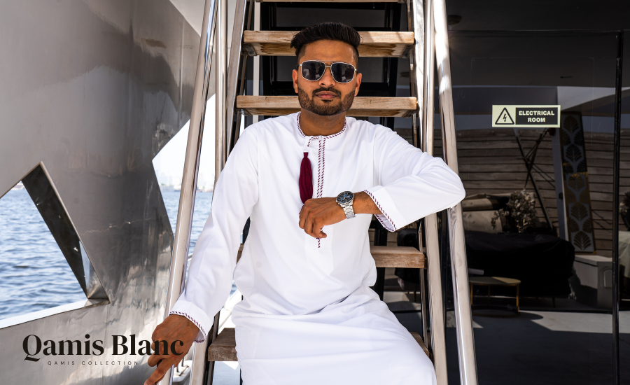 First, you choose the style. The Emirati Qamis remains the most popular — the one you’ll see most often in Dubai, with its long sleeves and sleek straight cut that truly gives an elegant look.