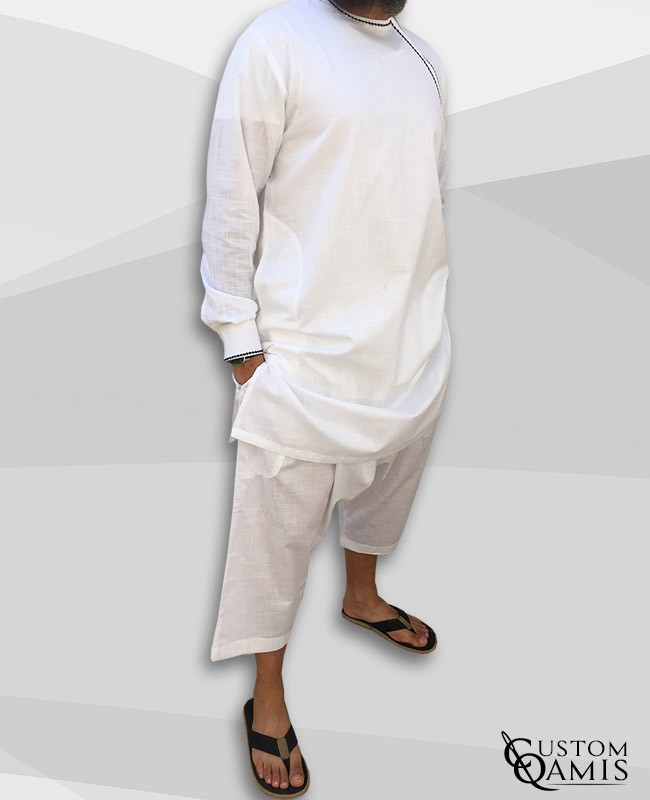 Pakistani set, Imad Thobe with a small zipped opening on the side and sarouel qandrissi cut. Slightly stiff cloth upscale linen white woven in India. Embrodery 6 black color.