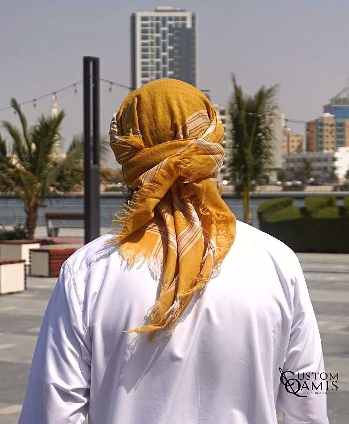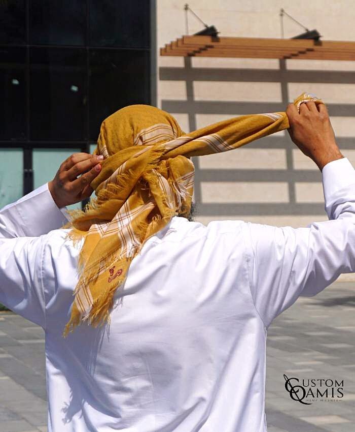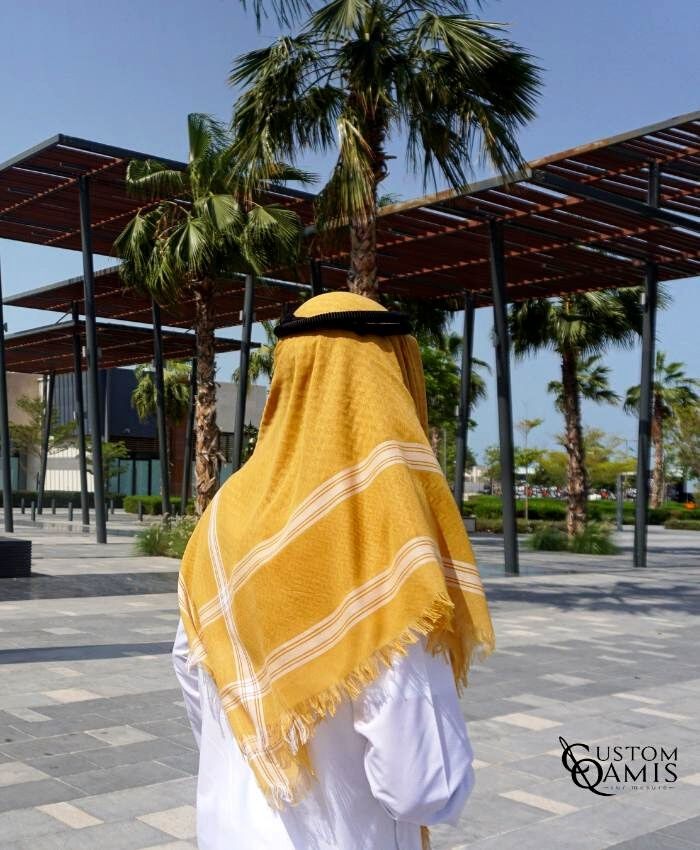 It is also perfect for use during winter. Wrap it around your neck or on the head for best protection from strong winds, sun, sand and snow. The yellow color makes it possible to highlight even more the qamis worn by the person.