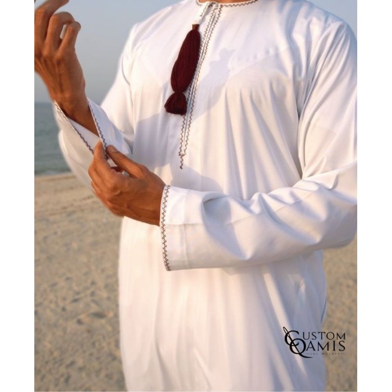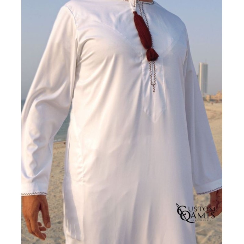 Le Qamis Omani en tissu Precious, couleur Blanc Matt. La couleur bordeaux a été choisi pour les broderies et la Tarboucha. Le Qamis Omani est le vêtement traditionnel du Sultanat d'Oman et des Comores. Le Tissu Precious blanc est parfait pour l'été mais aussi pour toutes saisons.