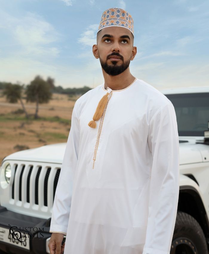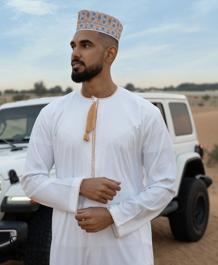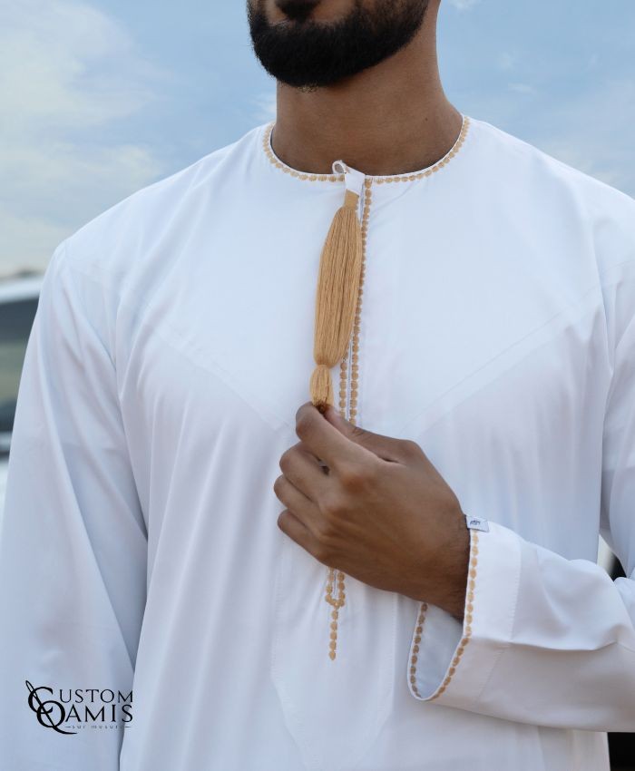 Le Qamis Omani en tissu Luxury, couleur Blanc Mat. La couleur Marron Clair mat a été choisi pour les broderies et la Tarboucha. Le Qamis Omani est le vêtement traditionnel du Sultanat d'Oman et des Comores. Le Tissu Luxury est de très grande qualité et il est parfait pour l'été mais aussi pour toutes saisons.